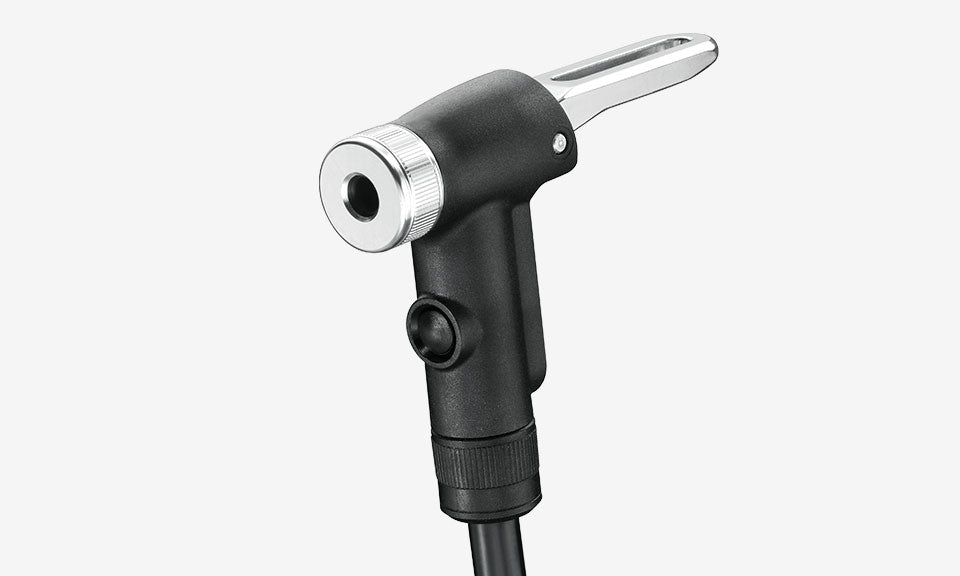 Half air compressor – Half pump. The JoeBlow® Booster pump just made it easier to install tubeless tyres. This pump has an integrated aluminum air chamber that stores an air charge of one liter, up to 160psi / 11 bar, to quickly fill your tyre and ensure the proper installation on a tubeless rim, just like a shop compressor. Once you flip the selector from “CHARGE” to “INFLATE” mode, air bypasses the chamber and flows directly into your tyre like a standard pump. The top-mounted easy to read gauge, air release button and comfortable dual density polymer grip, combined with its extra-long hose and stable base makes mounting tubeless and standard tyres a breeze!