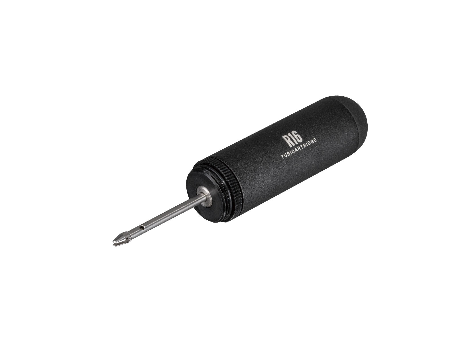 A road bike tubeless tyre repair kit stored compactly in a CO2 cartridge style pod used alone for tyre repairs or additionally with CO2 inflator for tire inflation. Mount to saddle rails or bike frame with HybridMaster Mini, TubiMaster GX DF, NanoMaster DF, or TubiMaster GXT Bolt-on for a complete tubeless tyre repair and/or inflation solution.