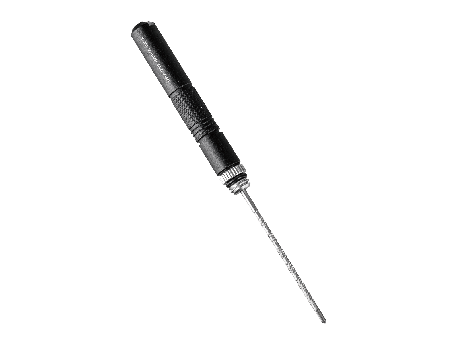 Precision CNC machined aluminum Tubi Valve Cleaner allows to remove or tighten two-piece Presta valve core and clear tire sealant clogs from valve stem for tubeless tire maintenance. Compact size easily fits in a jersey pocket or saddle, or mount with TubiPod Max for a ride.