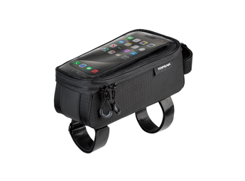 A top tube bag and phone case 2-in-1 design, featuring a transparent protective film that allows you to operate your phone while it's inside the bag. The second compartment of the bag features dividers that allow you to easily organize and store small items such as credit cards, loose change, keys, and other personal belongings.