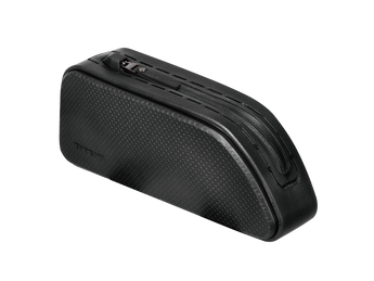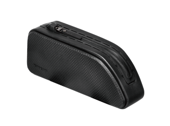 A hard shell, weatherproof top tube mounted bag features a streamlined shape to eliminate leg contact. Large capacity zippered compartment gives cyclists quick and easy access to energy bars, smartphone, tools or any small essential gear they need.