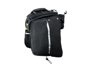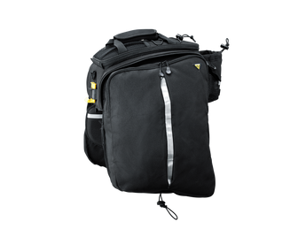 Large capacity MTX TrunkBag containing one main divided compartment with two expandable pannier side panels and rear water bottle holder. Our unique construction process provides rigidity and water repellency. Compatible with all MTX QuickTrack® racks with attached side frames. MTX Dual Side Frames are required when using side panniers on MTX BeamRacks.