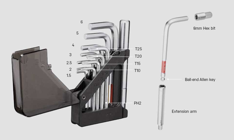 1.5 / 2 / 2.5 / 3 / 4 / 5 / 6 mm ball end Allen wrenches 8 mm Allen bits T10 / T15 / T20 / T25 Torx® wrenches #2 Philips screw driver |