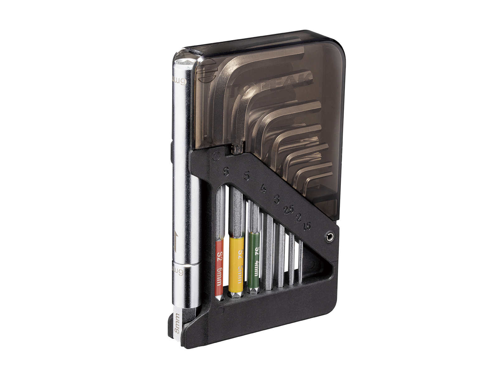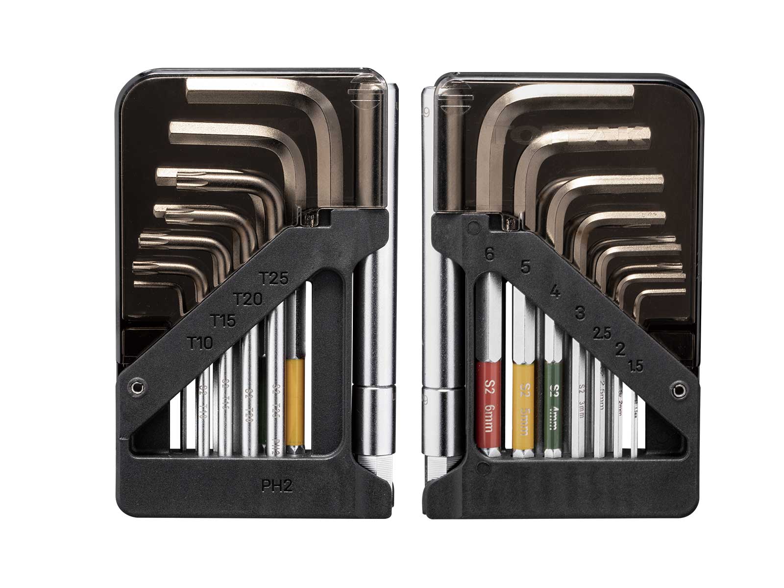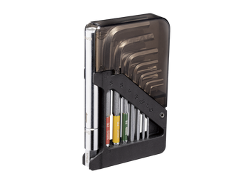 A unique 15 function ball-end Allen wrench set and Torx wrench set stored in an innovative organizer folding body that’s small enough to fit in a jersey pocket or saddle bag. Included extension arm adds leverage on 5 / 6 / 8 mm hex tools when needed.